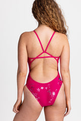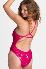 The Perry is a non-adjustable swim onesie that features contrasting stitching and binding for an athletic look. The contemporary design includes two over-the-shoulder straps that criss-cross along the back and transition into a cut-out detail along the ribcage.