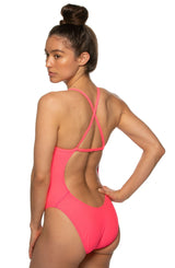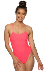 One of our bestselling styles, the Brandon is an adjustable fixed-back, full coverage one piece swimsuit with a criss-cross strap along the back. The strap is designed as one continuous band, which allows flexible distribution of tension along the shoulders and back.