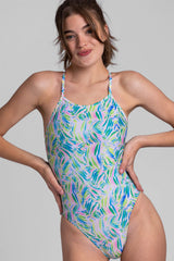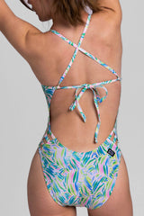 The Gavin is a tie-back swim onesie with a four-strap cut out detail on the hip. This swim onesie offers medium/full bum coverage and adjustable back straps, as well as sturdy fabric that stretches along the length of the body for easy moving during your workout.