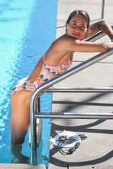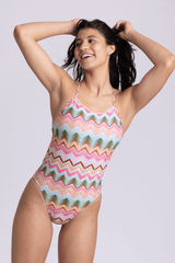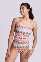 The Julian is a fixed-back one piece swimsuit with a criss-cross strap along the back and a four-band cut out detail along the hip. The strap is designed as one continuous band, which allows flexible distribution of tension along the shoulders and back during your water workout.