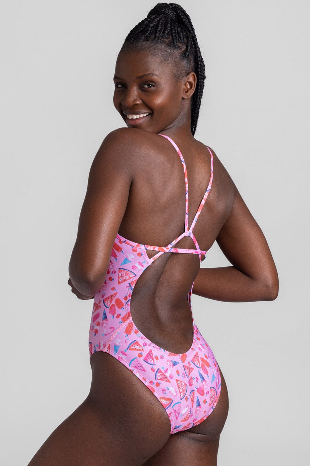 The Perry is a non-adjustable swim onesie that features printing stitching and binding for an athletic look. The contemporary design includes two over-the-shoulder straps that criss-cross along the back and transition into a cut-out detail along the ribcage.